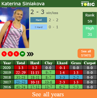 Siniakova has a 1-3 win-loss record in 2020, 1-2 on hard (See FULL STATS).