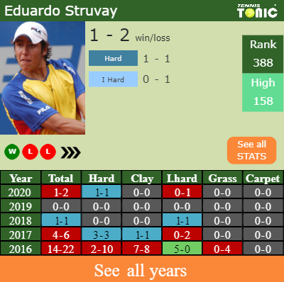 Eduardo has a 1-2 win-loss record in 2020, 0-1 on indoor hard courts (See FULL STATS).