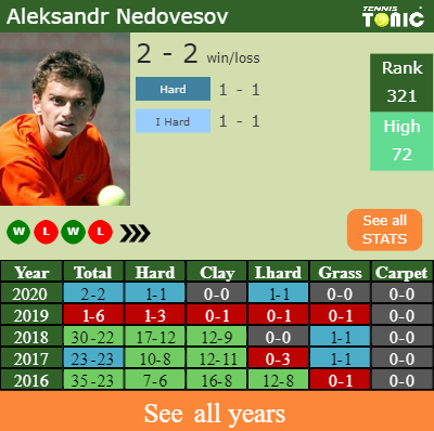 Aleksandr has a 2-2 win-loss record in 2020, 1-1 on indoor hard courts (See FULL STATS).