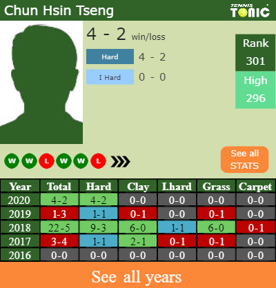 Talking about his overall career, Hsin Tseng has an overall 30-14 record. He has negative 1-2 record on indoor hard courts.