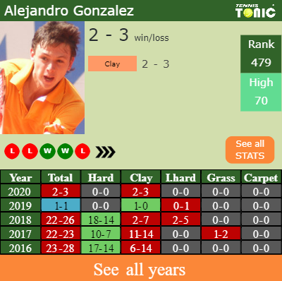 Gonzalez has a 2-3 win-loss record in 2020, 0-0 on hard (See FULL STATS).