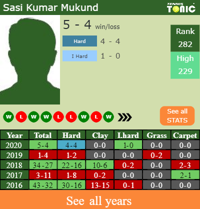 Kumar Mukund has a solid win-loss record in the last 7 years having won 65% of his matches (7-13). 1-0 on indoor hard courts in 2020. Talking about his performance on the same surface of this event, Kumar Mukund has a 97-89 record in the last 7 years on indoor hard courts.