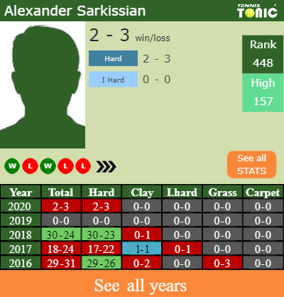 Sarkissian has a 2-3 win-loss record in 2020, 2-3 on hard (See FULL STATS).