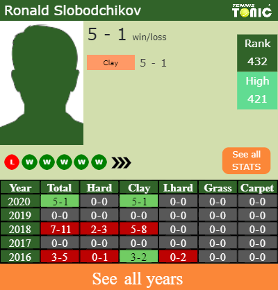 Ronald has a 5-1 win-loss record in 2020, 0-0 on hard (See FULL STATS).