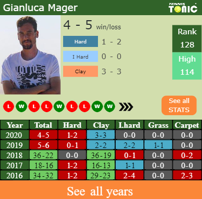 Mager has a winning record in the last 7 years having won 57% of his matches (469-355). 3-3 on clay in 2020. Regarding his performance on the same surface of this tournament, Mager has a 106-104 win-loss record in the last 7 years on clay.