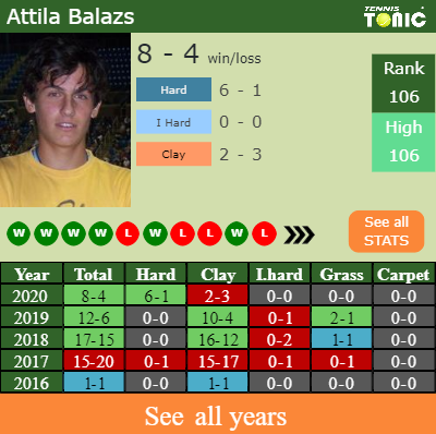Balazs has a 8-4 win-loss record in 2020, 2-3 on clay (See FULL STATS).