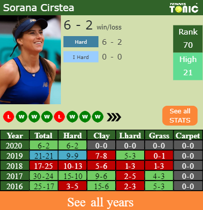 Cirstea has a winning record in the last 10 years having won 52% of her matches (522-487). 6-2 on hard in 2020. Talking about her performance on the same surface of this tournament, Cirstea has a 203-195 record in the last 10 years on hard.