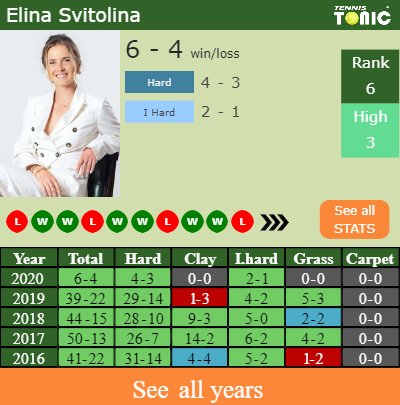 The Ukrainian has a 6-4 win-loss record in 2020, 4-3 on hard (See FULL STATS).