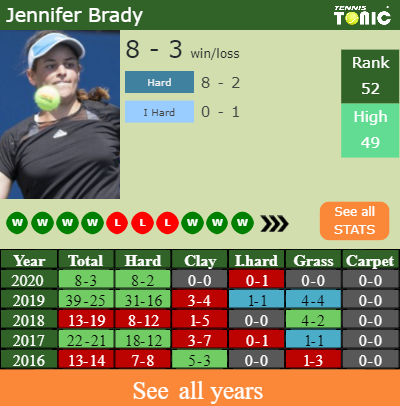 Brady has a solid record in the last 7 years having won 60% of her matches (531-358). 8-2 on hard in 2020. Talking about her performance on the same surface of this event, Brady has a 99-89 win-loss record in the last 7 years on hard.
