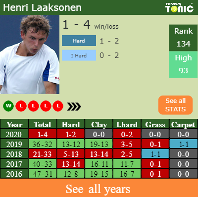 Laaksonen has a 1-4 win-loss record in 2020, 1-2 on hard (See FULL STATS).