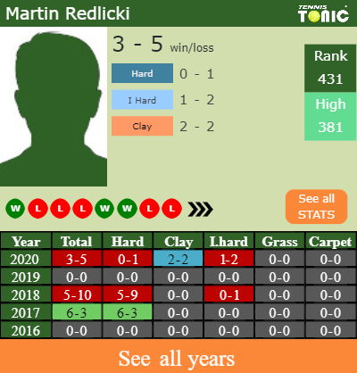 In terms of his career, Redlicki has an overall 18-21 record. He has negative 15-16 record on hard.