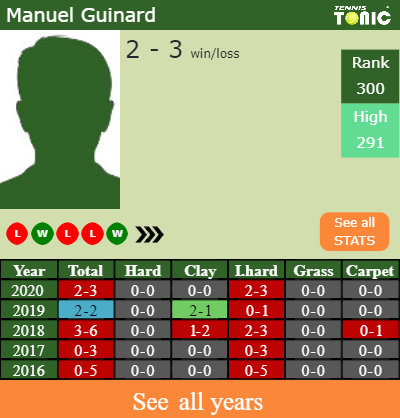 Guinard has a negative record in the last 7 years having won 27% of his matches (29-77). 2-3 on indoor hard courts in 2020. Regarding his performance on the same surface of this tournament, Guinard has a 10-24 win-loss record in the last 7 years on indoor hard courts.