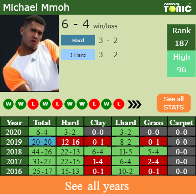 Mmoh has a 6-4 win-loss record in 2020, 3-2 on indoor hard courts (See FULL STATS).