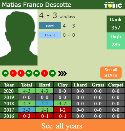 Franco Descotte has a winning record in the last 7 years having won 55% of his matches (41-33). 4-3 on hard in 2020. Regarding his performance on the same surface of this tournament, Franco Descotte has a 15-14 win-loss record in the last 7 years on hard.