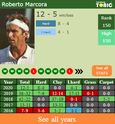 Marcora has a 12-5 win-loss record in 2020, 4-1 on indoor hard courts (See FULL STATS).