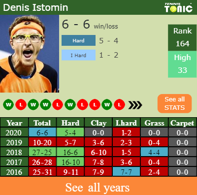 Istomin has a winning record in the last 10 years having won 56% of his matches (591-466). 5-4 on hard in 2020. In connection with his performance on the same surface of this tournament, Istomin has a 251-250 win-loss record in the last 10 years on hard.