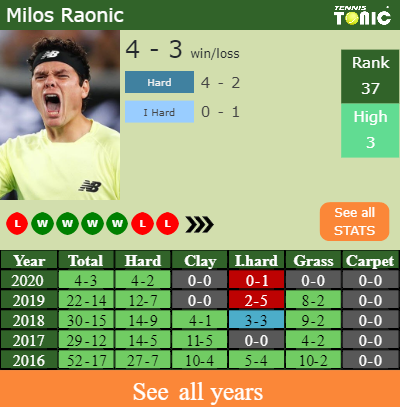 Milos has a 4-3 win-loss record in 2020, 4-2 on hard (See FULL STATS).