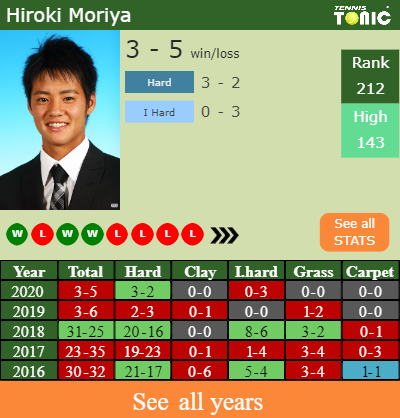 Hiroki has a 3-5 win-loss record in 2020, 0-3 on indoor hard courts (See FULL STATS).