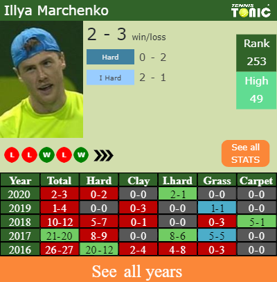 Marchenko has a solid record in the last 10 years having won 61% of his matches (350-225). 2-1 on indoor hard courts in 2020. Talking about his performance on the same surface of this event, Marchenko has a 240-195 win-loss record in the last 10 years on indoor hard courts.