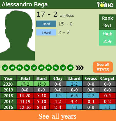 Bega has won exactly 50% of his matches (112-112) in the last 9 years. 2-2 on indoor hard courts in 2020. Regarding his performance on the same surface of this competition, Bega has a 72-80 win-loss record in the last 9 years on indoor hard courts.