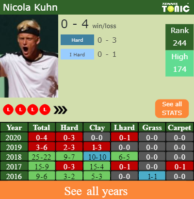 Kuhn has a 0-4 win-loss record in 2020, 0-1 on indoor hard courts (See FULL STATS).