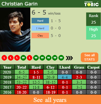 Garin has a 6-5 win-loss record in 2020, 5-0 on clay (See FULL STATS).