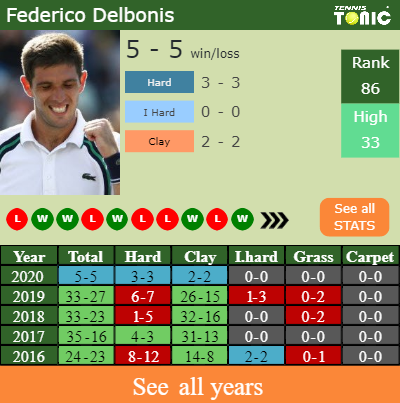 Federico has a 5-5 win-loss record in 2020, 2-2 on clay (See FULL STATS).