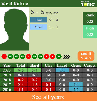 Kirkov has won exactly 50% of his matches (5-5) in the last 5 years. 1-1 on indoor hard courts in 2020. In connection with his performance on the same surface of this event, Kirkov has a 9-15 win-loss record in the last 5 years on indoor hard courts.
