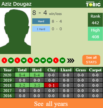 Dougaz has a solid win-loss record in the last 5 years having won 68% of his matches (49-23). 8-4 on hard in 2020. Talking about his performance on the same surface of this competition, Dougaz has a 11-6 record in the last 5 years on hard.
