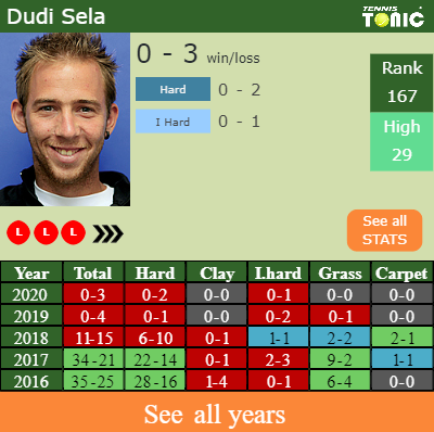 Dudi has a 0-3 win-loss record in 2020, 0-2 on hard (See FULL STATS).