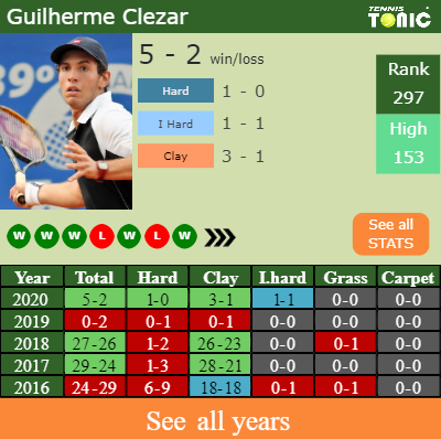Clezar has a negative record in the last 10 years having won 44% of his matches (138-173). 1-0 on hard in 2020. Talking about his performance on the same surface of this event, Clezar has a 205-204 record in the last 10 years on hard.