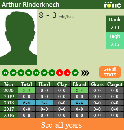 Rinderknech has a 8-3 win-loss record in 2020, 8-3 on indoor hard courts (See FULL STATS).