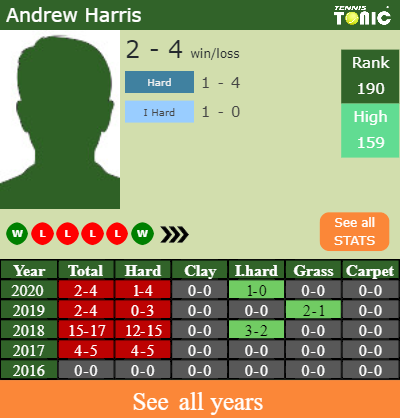Harris has a negative record in the last 7 years having won 34% of his matches (33-17). 1-0 on indoor hard courts in 2020. Talking about his performance on the same surface of this tournament, Harris has a 36-41 win-loss record in the last 7 years on indoor hard courts.