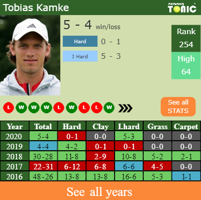 Kamke has a winning record in the last 10 years having won 58% of his matches (408-291). 5-3 on indoor hard courts in 2020. Regarding his performance on the same surface of this competition, Kamke has a 262-247 record in the last 10 years on indoor hard courts.