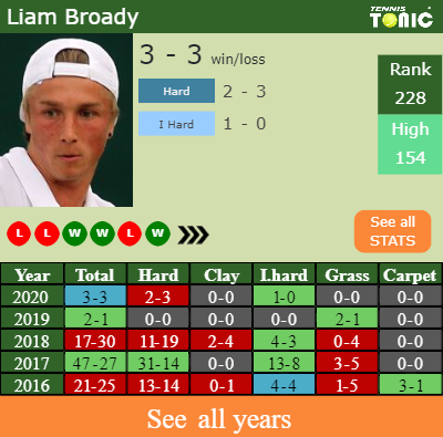 Broady has a winning win-loss record in the last 10 years having won 57% of his matches (200-148). 1-0 on indoor hard courts in 2020. In connection with his performance on the same surface of this competition, Broady has a 140-134 record in the last 10 years on indoor hard courts.