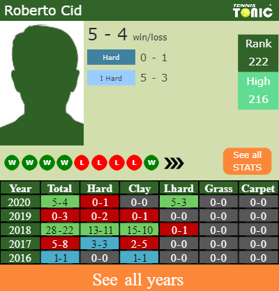 Cid has a unfavourable record in the last 7 years having won 46% of his matches (45-38). 5-3 on indoor hard courts in 2020. Talking about his performance on the same surface of this tournament, Cid has a 39-39 win-loss record in the last 7 years on indoor hard courts.