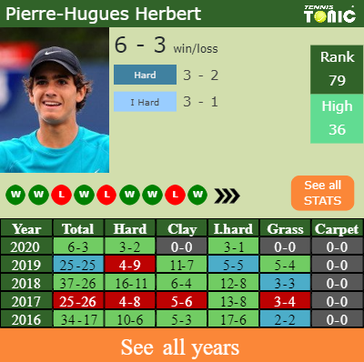 Herbert has a solid win-loss record in the last 10 years having won 63% of his matches (527-308). 3-1 on indoor hard courts in 2020. Regarding his performance on the same surface of this tournament, Herbert has a 248-203 win-loss record in the last 10 years on indoor hard courts.