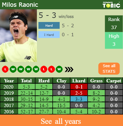 Raonic has a 5-3 win-loss record in 2020, 5-2 on hard (See FULL STATS).
