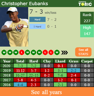 Eubanks has a 7-3 win-loss record in 2020, 7-2 on hard (See FULL STATS).