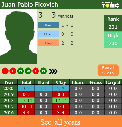 Pablo Ficovich has a negative record in the last 7 years having won 44% of his matches (7-9). 1-1 on hard in 2020. Talking about his performance on the same surface of this tournament, Pablo Ficovich has a 40-42 win-loss record in the last 7 years on hard.