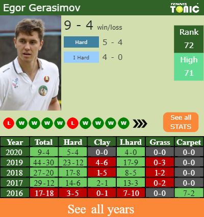 Gerasimov has a 9-4 win-loss record in 2020, 4-0 on indoor hard courts (See FULL STATS).