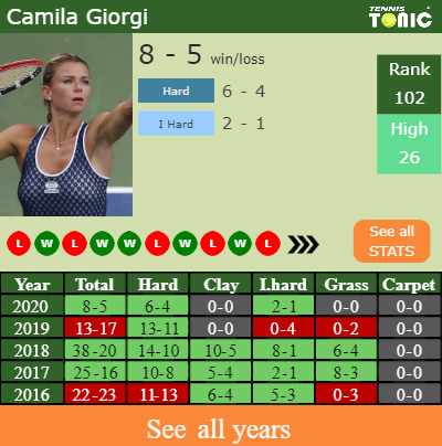 Giorgi has a 8-5 win-loss record in 2020, 6-4 on hard (See FULL STATS).