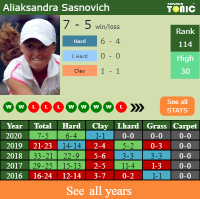Aliaksandra has a 7-5 win-loss record in 2020, 6-4 on hard (See FULL STATS).