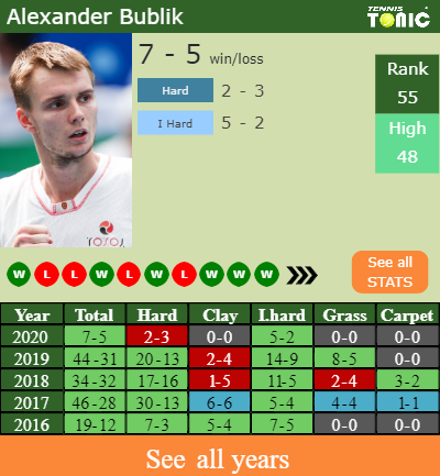 Bublik has a solid record in the last 7 years having won 63% of his matches (223-129). 5-2 on indoor hard courts in 2020. Talking about his performance on the same surface of this event, Bublik has a 159-115 record in the last 7 years on indoor hard courts.