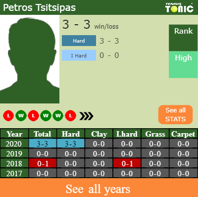 Tsitsipas has a 3-3 win-loss record in 2020, 3-3 on hard (See FULL STATS).