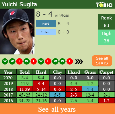 Sugita has a 8-4 win-loss record in 2020, 8-4 on hard (See FULL STATS).