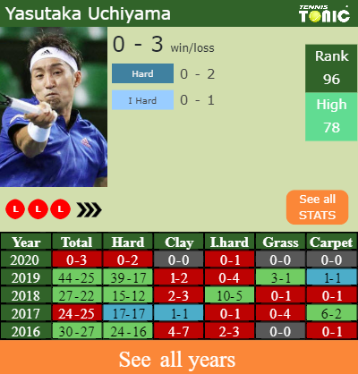 Uchiyama has a 0-3 win-loss record in 2020, 0-2 on hard (See FULL STATS).