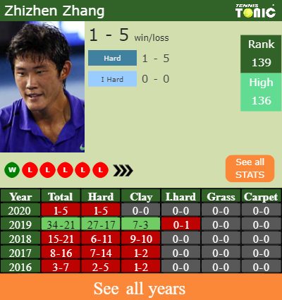 Zhang has a 1-5 win-loss record in 2020, 1-5 on hard (See FULL STATS).