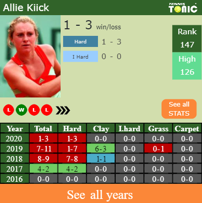 Kiick has a 1-3 win-loss record in 2020, 1-3 on hard (See FULL STATS).