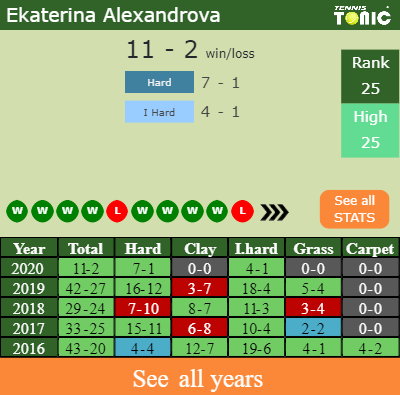 Ekaterina has a 11-2 win-loss record in 2020, 7-1 on hard (See FULL STATS).